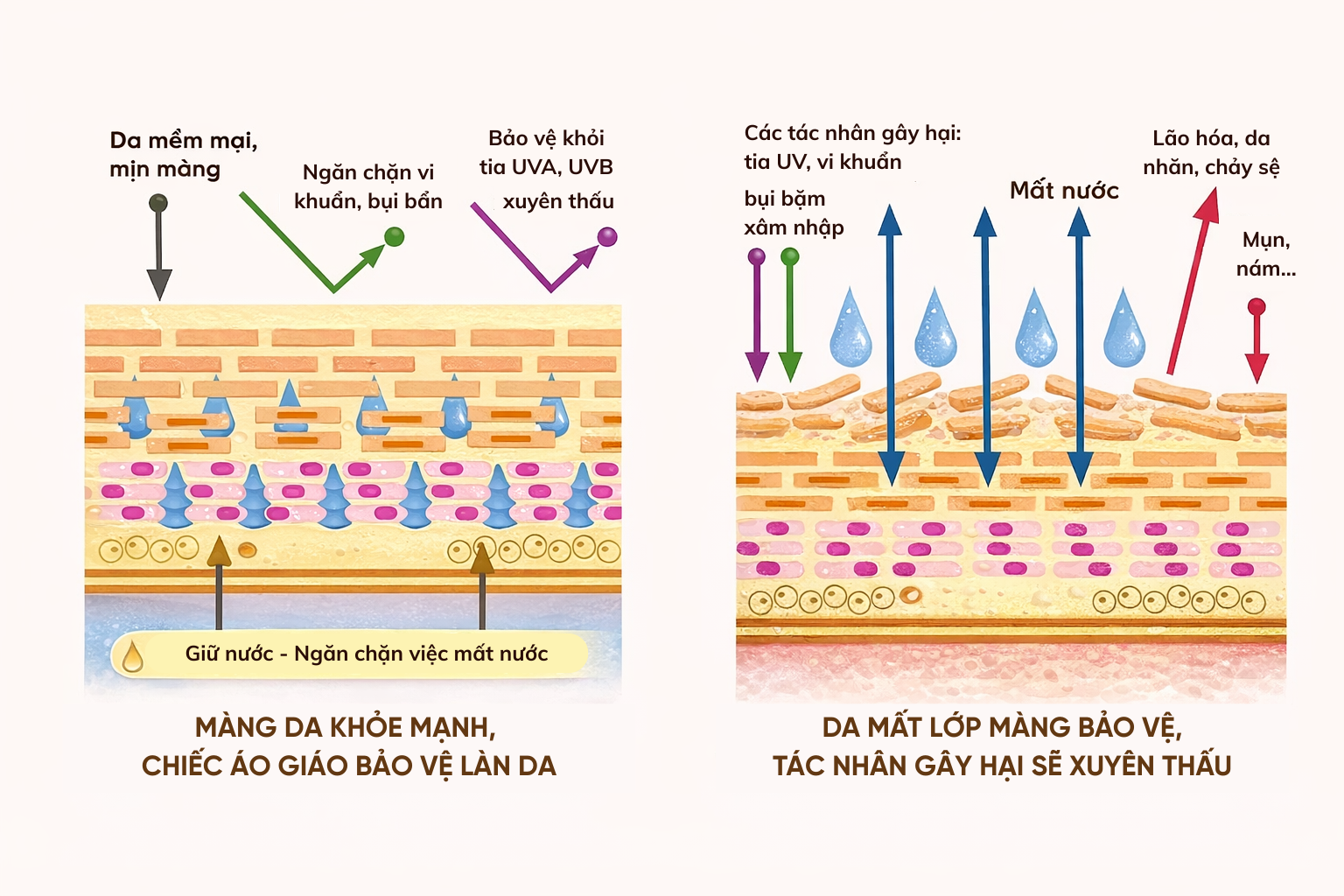 Ngược lại, nếu làm sạch quá mức hoặc sai phương pháp, da sẽ bị tổn thương hàng rào bảo vệ, dẫn đến mất nước, nhạy cảm và dễ kích ứng hơn.