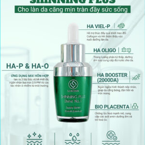 Serum Lurcinn Shinning Plus – Shine No.1 Với kích thước phân tử HA siêu nhỏ giúp thấm sâu vào da giúp da được dưỡng ẩm tối ưu giúp ngăn ngừa lão hóa da và ngăn ngừa hình thành nếp nhăn, thúc đẩy chu trình sản sinh collagen. Ngoài ra sản phẩm còn có giúp phục hồi da, giúp trẻ hóa da mang lại một làn da mịn màng và săn chắc